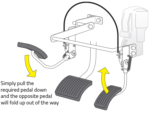 Designed for automatic vehicles with hanging pedals (mounted from the bulkhead), the Twin Folding system mechanically replicates the standard accelerator pedal on the left side of the brake.