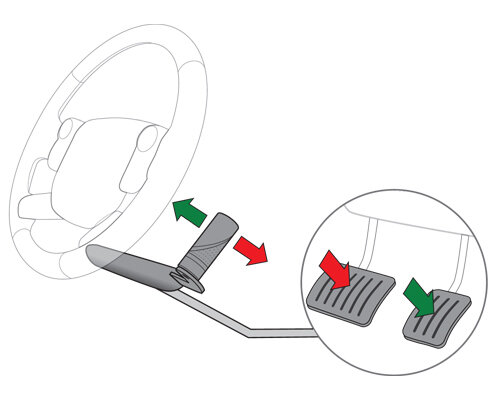 The intuitive push/pull mechanism allows you to control your vehicle effortlessly. Pull the lever towards you to accelerate (squeezing with fingers around the steering wheel) and push forward to brake (using palm or fingertips). The system provides almost no resistance, with a light, responsive feel that replicates the true sensation of the pedals.