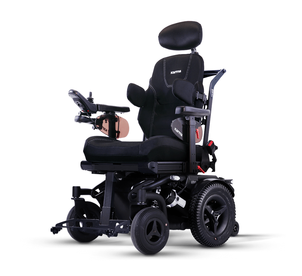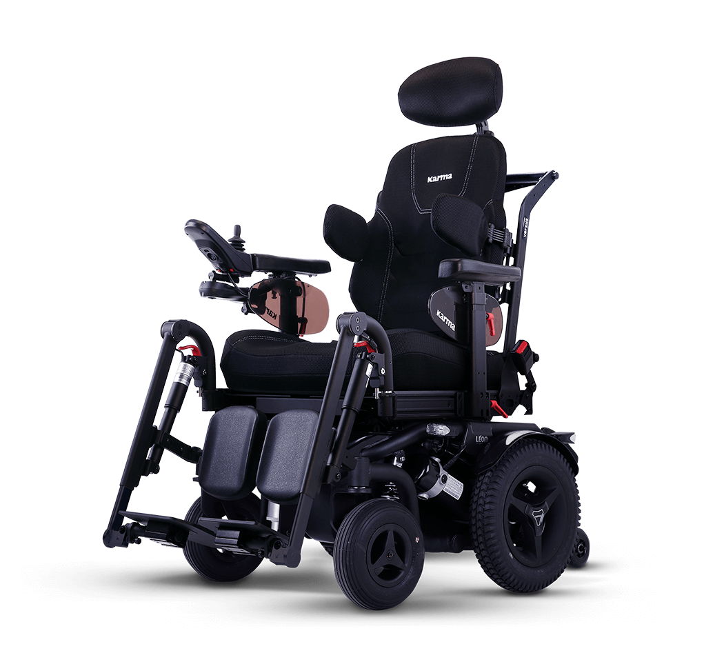 The Leon R Versus is a premium indoor/outdoor rear-wheel drive powered wheelchair featuring Karma’s advanced Versus seating system. Designed for stability and comfort, it combines 4-wheel independent suspension with customizable positioning options.